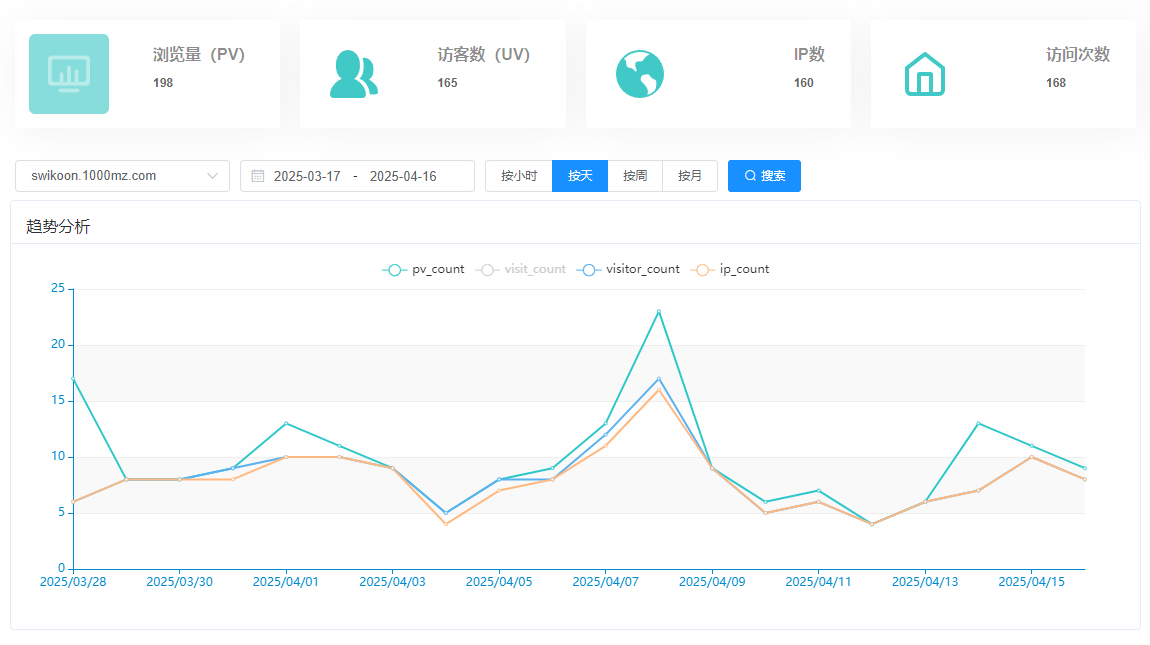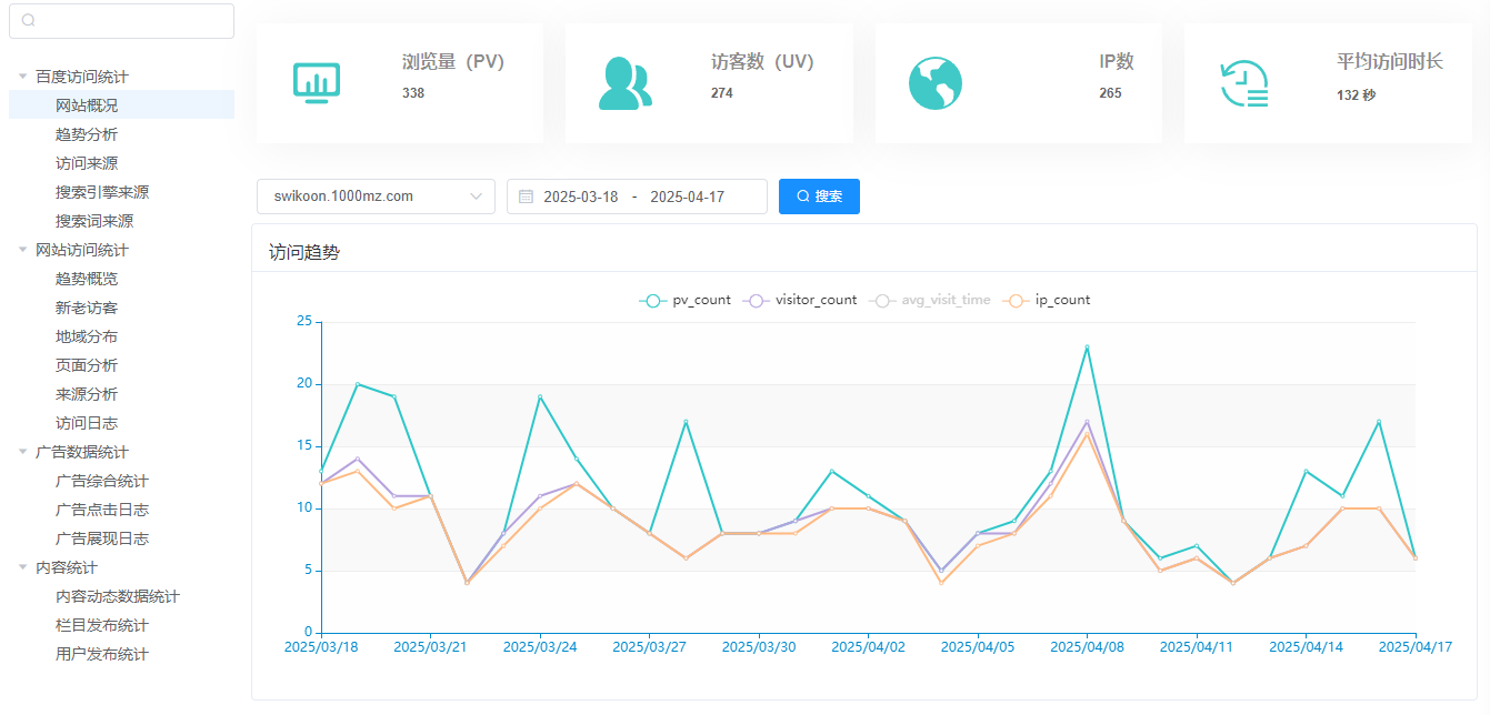 内置网站访问统计,提供网站PV/UV/IP趋势统计,地域访问统计,搜索引擎来源统计,搜索词统计等。支持对接百度统计,支持内容浏览量/收藏/点赞/评论统计、广告点击/展现统计等。
