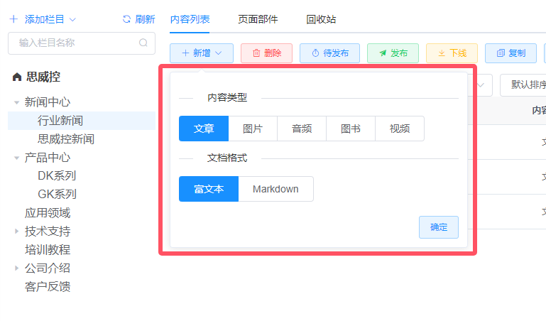 系统默认提供了多种常见内容形式支持,包括富文本、Markdown、图片集、音视频集等。不同类型的内容通过不同的扩展页面提供个性化方便的操作界面支持。